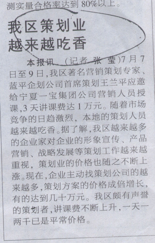 7月7日至9日,我區(qū)著名營(yíng)銷策劃專家、藍(lán)平企劃公司首席策劃王藍(lán)平應(yīng)邀給寧夏一寶集團(tuán)公司營(yíng)銷人員授課,3天講課費(fèi)達(dá)1萬(wàn)元。隨著市場(chǎng)競(jìng)爭(zhēng)的日趨激烈,本地的策劃人員越來(lái)越吃香。據(jù)了解,我區(qū)越來(lái)越多的企業(yè)家對(duì)企業(yè)的形象宣傳、產(chǎn)品營(yíng)銷、戰(zhàn)略發(fā)展等策劃工作越來(lái)越重視,策劃業(yè)的價(jià)格也隨之不斷上漲。現(xiàn)在,企業(yè)主動(dòng)找策劃公司的越來(lái)越多,策劃方案的價(jià)格成倍的增長(zhǎng),有的達(dá)到幾十萬(wàn)元。我區(qū)頗有聲望的策劃者,講課費(fèi)不斷上升,一天一兩千已是平常價(jià)格。